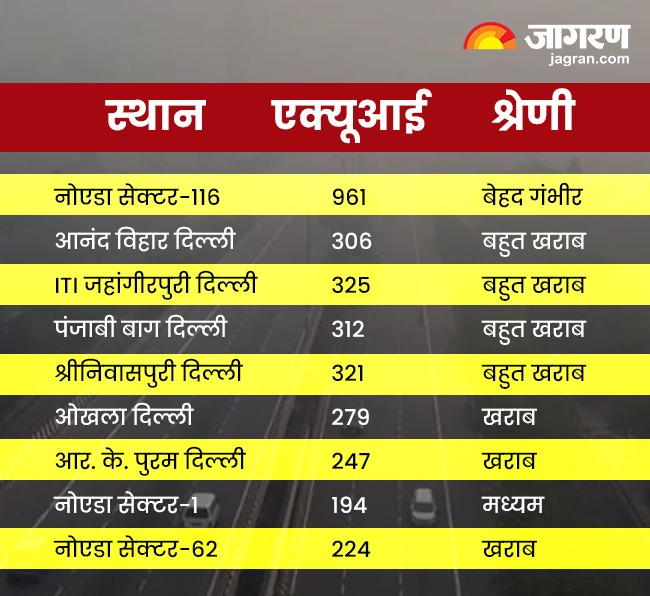 दिल्ली-एनसीआर में वायु गुणवत्ता सूचकांक (एक्यूआई) में थोड़ी राहत मिली है लेकिन नोएडा के सेक्टर-116 में एक्यूआई 961 दर्ज किया गया है जो बेहद गंभीर श्रेणी में आता है। वहीं दिल्ली के अधिकांश इलाकों में एक्यूआई 400 से नीचे रहा। कोहरा भी कम हुआ है जिससे हाईवे पर वाहनों को चलने में परेशानी कम हुई है। जानिए आज दिल्ली-एनसीआर में कहां कितना रहा एक्यूआई।