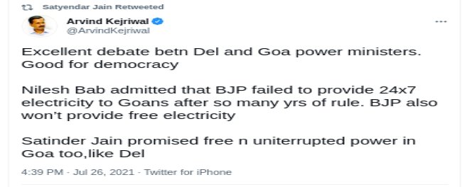 सत्येंद्र जैन के मुताबिक गोवा में लगातार बिजली कटौती होती रहती है, जिससे लोगों को परेशानियों का सामना करना पड़ता है। गोवा के सीएम ने किया ट्वीट बहस के बाद गोवा के मुख्यमंत्री प्रमोद सावंत ने ट्वीट कर कहा, 'कैब्रेल ने मिथ्या, झूठ की राजनीति और भ्रामक प्रचार के खिलाफ आज गोवा के लोगों का प्रतिनिधित्व किया और मुफ्तखोरी के मिथक को उजागर किया।' उन्होंने कहा कि उनकी सरकार ने आर्थिक सुधारों और कल्याणकारी योजनाओं के कार्यान्वयन के बीच समुचित संतुलन कायम किया है