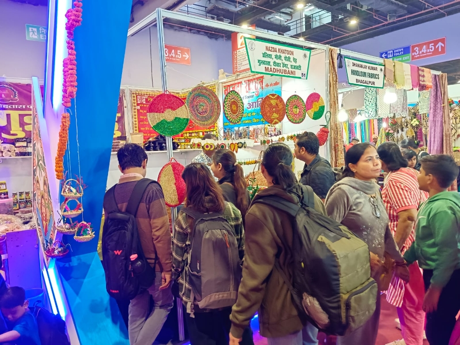 दिल्ली मंडप में तिहाड़ जेल के कैदियों द्वारा बनाए गए उत्पाद देखते दर्शक।