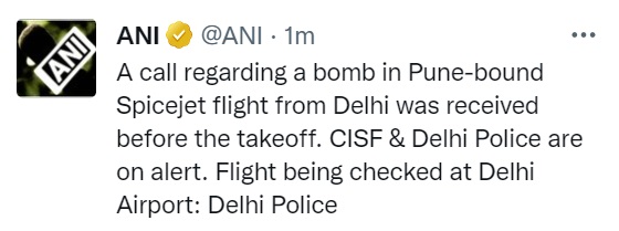दिल्ली पुलिस ने बताया कि फोन कर दिल्ली से पुणे जा रही फ्लाइट में बम होने के बारे में जानकारी दी गई है। यह सूचना तब मिली जब फ्लाइट दिल्ली एयरपोर्ट से पुणे के लिए उड़ान भरने वाली थी। इसके बाद तुरंत सुरक्षा एजेंसियां सतर्क हो गईं और तलाशी अभियान चलाया। इसके बाद यात्रियों को विमान से बाहर निकाल दिया गया था। एयरपोर्ट पर फ्लाइट की चेकिंग भी की गई।