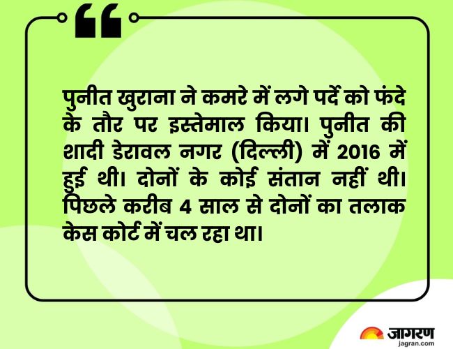 बताया गया कि पुनीत ने कमरे में लगे पर्दे को फंदे के तौर पर इस्तेमाल किया। पुनीत की शादी डेरावल नगर (दिल्ली) में 2016 में हुई थी। दोनों के कोई संतान नहीं थी। पिछले करीब चार साल से दोनों का तलाक केस कोर्ट में चल रहा था।