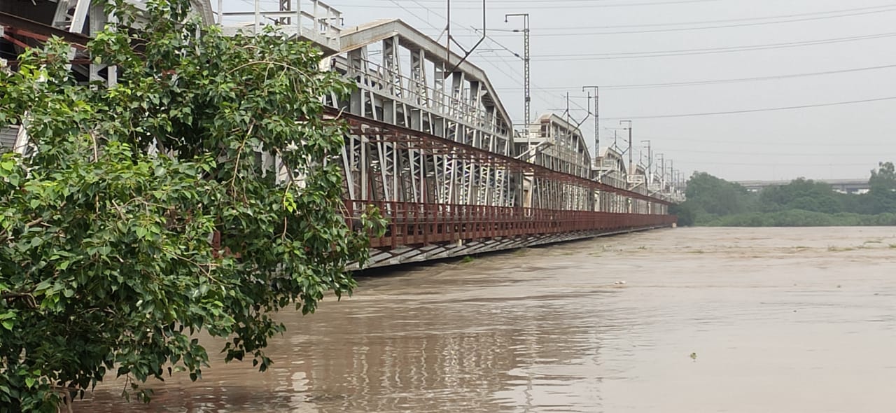 यमुना का पानी ऐतिहासिक लोहे के पुल को छूकर बह रहा है।