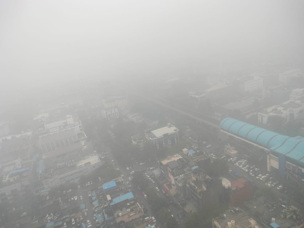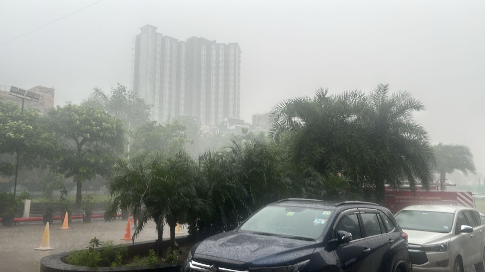 नोएडा के सेक्टर-16 स्थित WTT बिल्डिंग से बारिश का दृश्य।