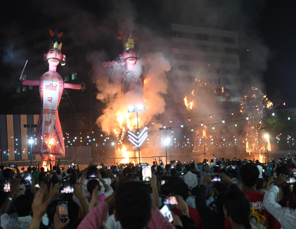 द्वारका सेक्टर-10 की रामलीला में धूं-धूं कर रावण, मेघनाद, कुंभकरण पुतलों के साथ महिलाओं पर अत्याचार करने वालों का पुतला।