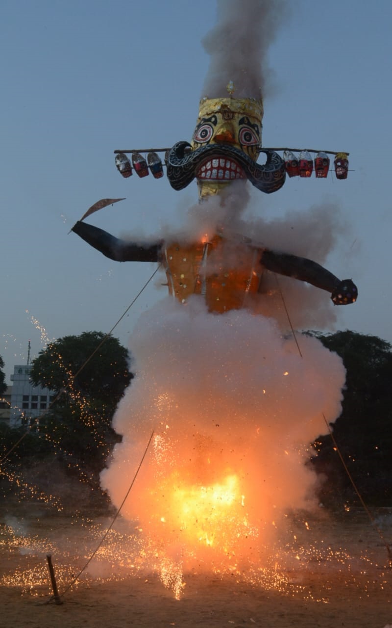 फरीदाबाद के एनआईटी स्थित दशहरा मैदान में धूं-धू कर जलता रावण का पुतला।