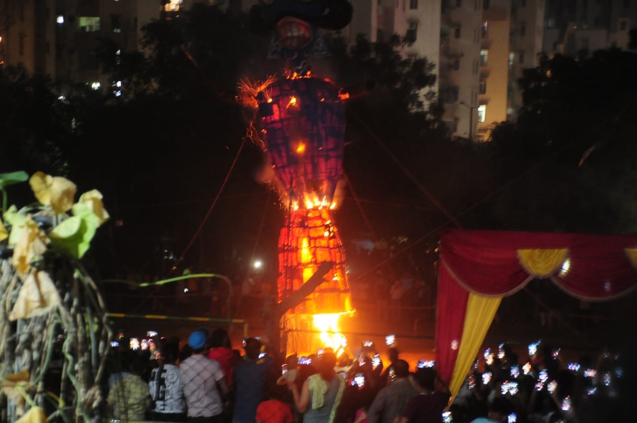 गाजियाबाद के इंदिरापुरम की शिप्रा सनसिटी में जलता रावण का पुतला।