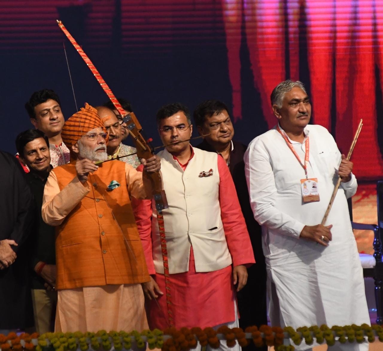 बुराई का नाश करने के लिए द्वारका सेक्टर-10 की रामलीला में तीर चलाते प्रधानमंत्री नरेन्द्र मोदी, साथ में सांसद प्रवेश वर्मा व लीला संरक्षक राजेश गहलौत।