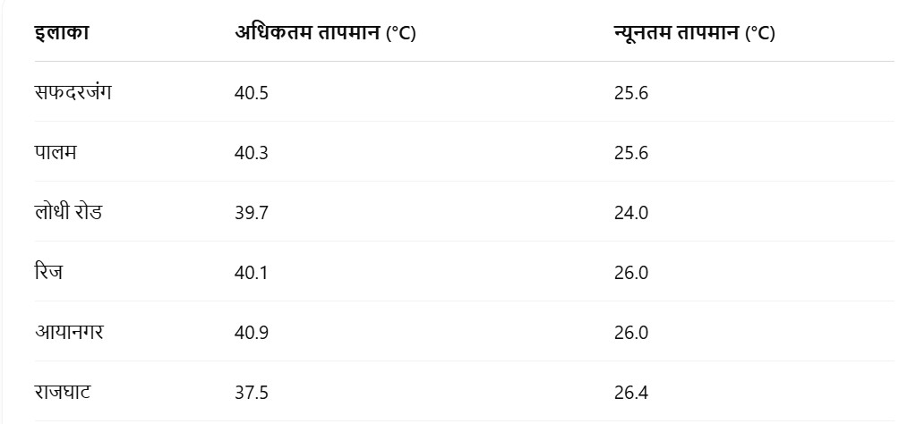 अधिकतम तापमान सामान्य से 5.4 डिग्री अधिक 40.5 डिग्री सेल्सियस दर्ज किया गया। यह पिछले दिन से आधा डिग्री कम है। आयानगर में यह सबसे अधिक 40.9 डिग्री रहा। हवा में नमी का स्तर 73 में से 31 दर्ज किया गया।