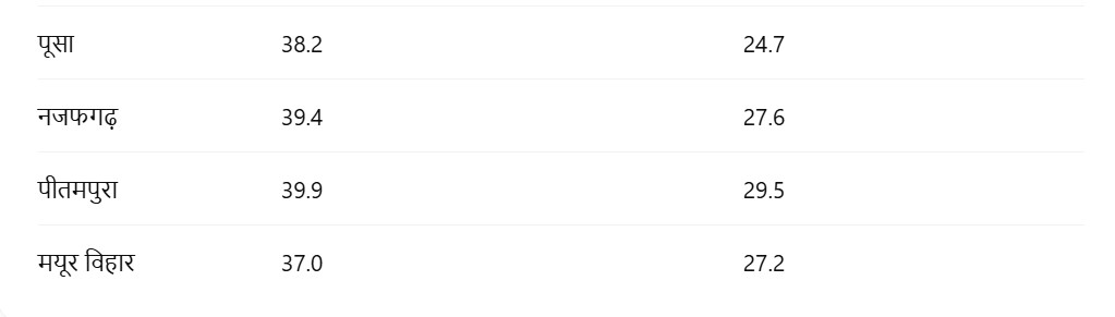 बुधवार को दिल्ली में सर्वाधिक अधिकतम एवं न्यूनतम तापमान वाले इलाके एवं वहां का तापमान (डिग्री से. में)