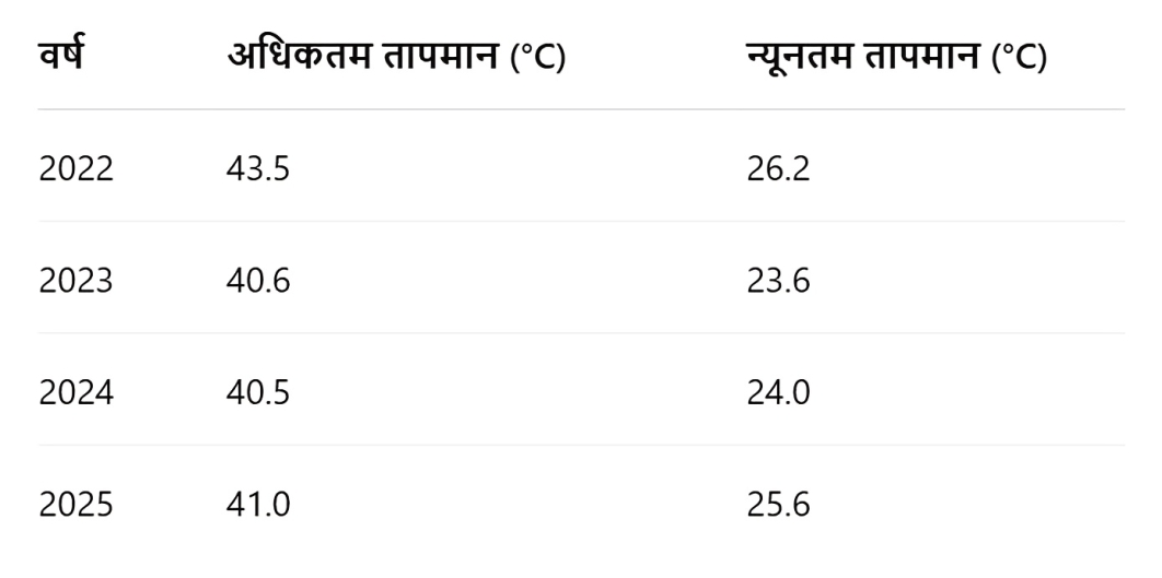 चार वर्षों (2022 से 2025) के दौरान अप्रैल का सर्वाधिक अधिकतम एवं न्यूनतम तापमान (डिग्री से. में)