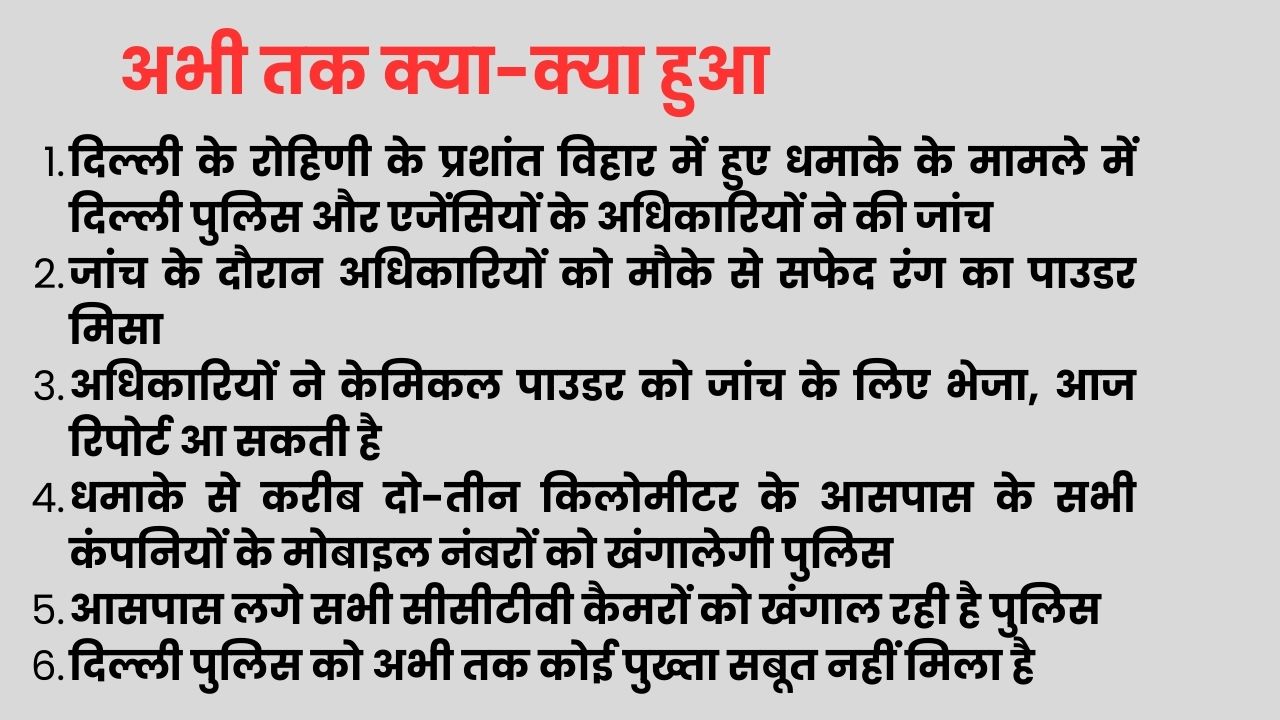 - दिल्ली के रोहिणी के प्रशांत विहार में हुए धमाके के मामले में दिल्ली पुलिस और एजेंसियों के अधिकारियों ने की जांच