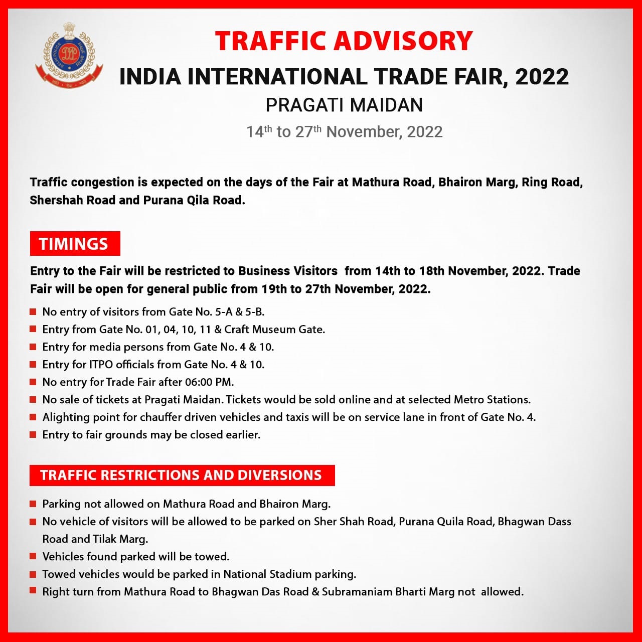 ट्रैफिक पुलिस ने कहा कि मथुरा रोड और भैरों मार्ग पर पार्किंग की अनुमति नहीं है, शेरशाह रोड, पुराना किला रोड, भगवान दास रोड और तिलक मार्ग पर आगंतुकों के किसी भी वाहन को पार्क करने की अनुमति नहीं दी जाएगी। अगर वाहन पार्क किए गए तो उन्हें जब्त कर लिया जाएगा। वहां से उन्हें नेशनल स्टेडियम पार्किंग में लाकर खड़ा कर दिया जाएगा। मथुरा रोड से भगवान दास रोड और सुब्रमण्यम भारती मार्ग की ओर दाएं मुड़ने की अनुमति नहीं है।