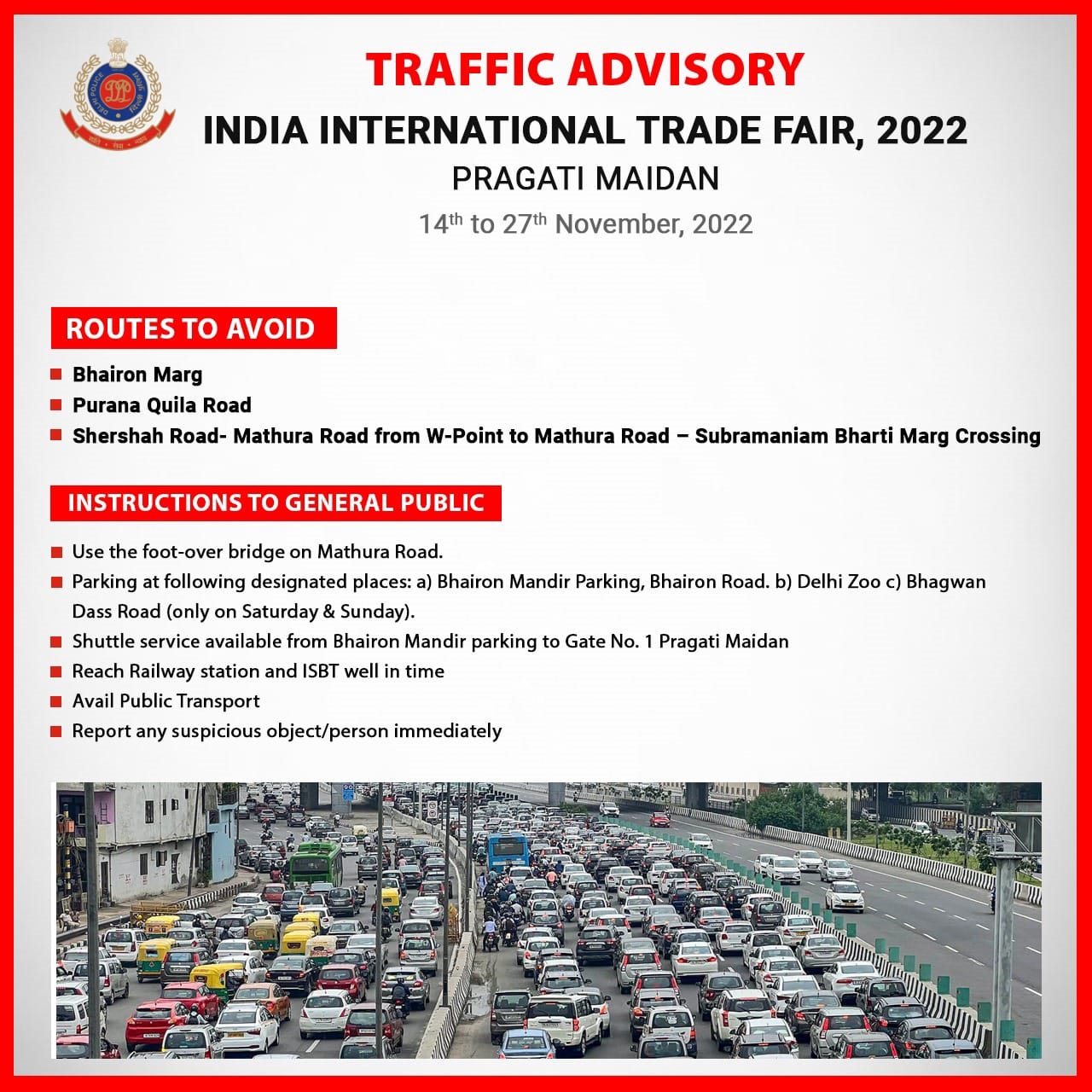 पार्किंग के लिए पर्याप्त जगह न होने के कारण अंतर्राष्ट्रीय व्यापार मेले (International Trade Fair) में आने वाले लोगों से सार्वजनिक परिवहन (Delhi Public Transport) का इस्तेमाल करने की अपील की है। इसके अलावा आम जनता से भी अनुरोध है कि मथुरा रोड पर फुट ओवर ब्रिज का प्रयोग करें।