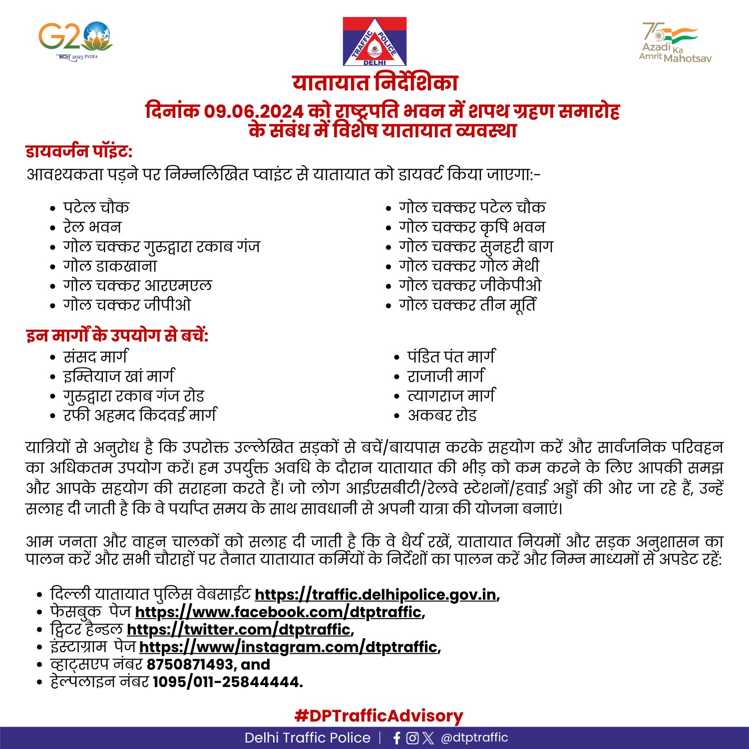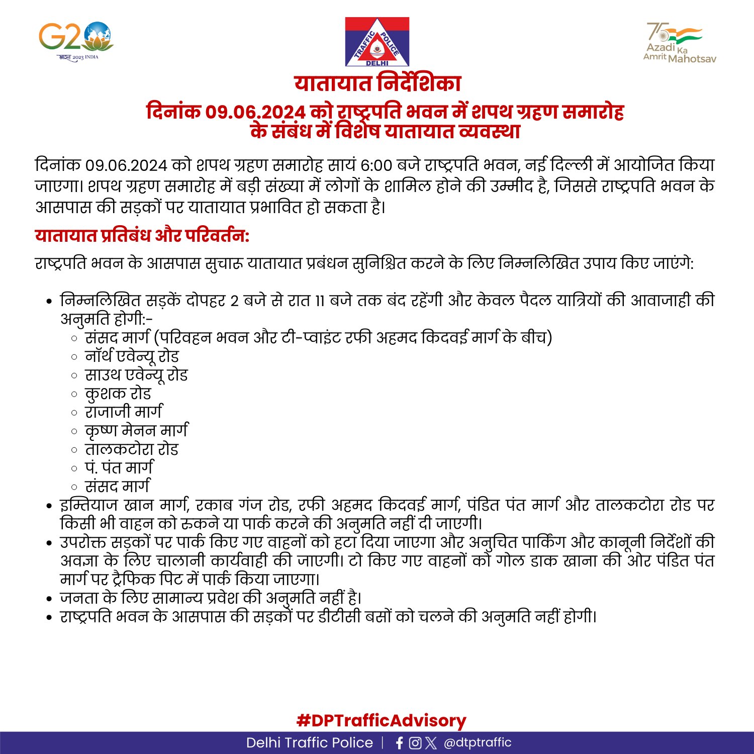 शपथ ग्रहण समारोह के मद्देनजर, 09.06.2024 को दोपहर 2:00 बजे से रात 11:00 बजे तक राष्ट्रपति भवन के आसपास विशेष यातायात व्यवस्था लागू रहेगी। कृपया निर्देशिका का पालन करें।#DPTrafficAdvisory pic.twitter.com/G15Pvc6NC7