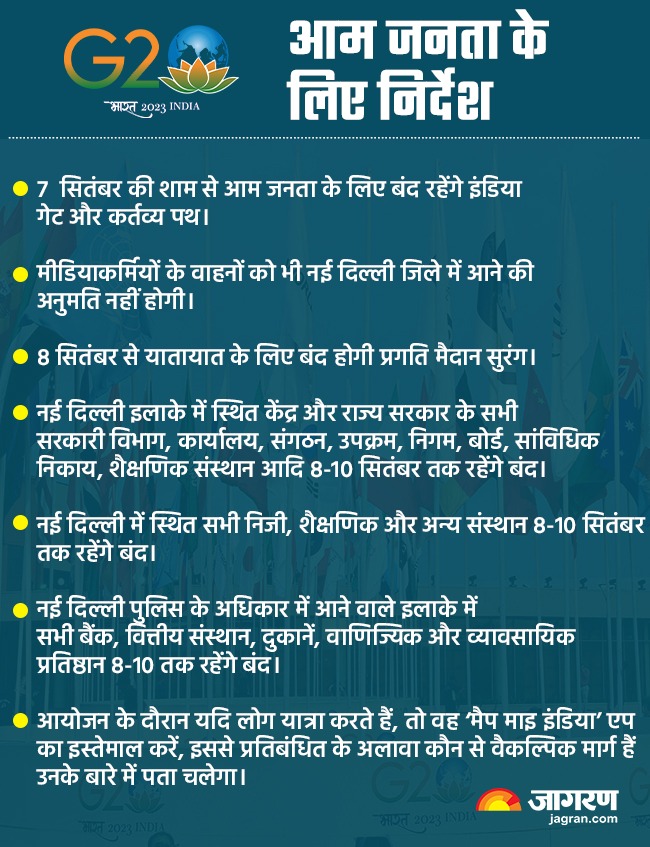ऐसे में नई दिल्ली जिले और एनडीएमसी क्षेत्र की कई सड़कें बंद रहेंगी। रिंग रोड (महात्मा गांधी मार्ग) के अंदर मथुरा रोड (आश्रम चौक से आगे), भैरों रोड, पुराना किला रोड और प्रगति मैदान सुरंग आठ सितंबर शाम पांच बजे से 10 सितंबर रात 12 बजे तक नियंत्रित क्षेत्र दो माना जाएगा। यहां पर भी केवल स्थानीय निवासियों और अधिकृत वाहनों और एयरपोर्ट और पुरानी दिल्ली और नई दिल्ली रेलवे स्टेशन जाने वाले यात्रियों के वाहनों को रिंग रोड से आगे नई दिल्ली जिले की तरफ सड़कों पर जाने की अनुमति होगी।