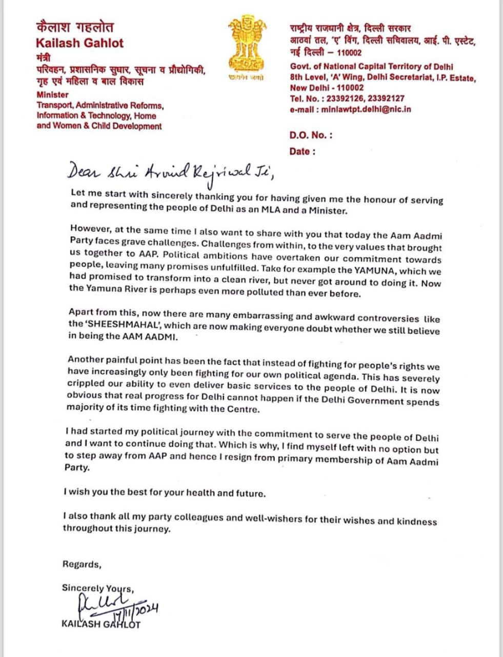 Delhi Minister and AAP leader Kailash Gahlot resign from primary membership of Aam Aadmi Party; writes to party national convenor Arvind Kejriwal.