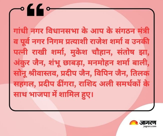 गांधी नगर विधानसभा (Delhi Election) के आप के संगठन मंत्री व पूर्व नगर निगम प्रत्याशी राजेश शर्मा व उनकी पत्नी राखी शर्मा, मुकेश चौहान, संतोष झा, अंकुर जैन, शंभू छाबड़ा, मनमोहन शर्मा बाली, सोनू श्रीवास्तव, प्रदीप जैन, विपिन जैन, तिलक सहगल, प्रदीप ढींगरा, राशिद अली समर्थकों के साथ भाजपा में शामिल हुए।