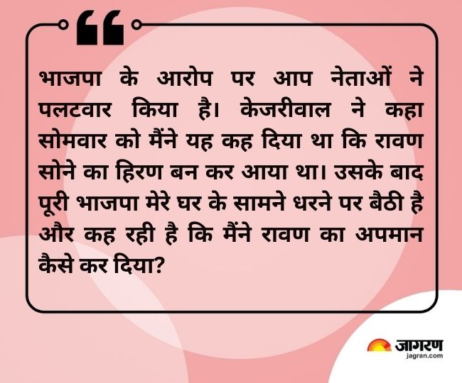 भाजपा के आरोप पर आप नेताओं ने पलटवार किया है। केजरीवाल ने कहा सोमवार को मैंने यह कह दिया था कि रावण सोने का हिरण बन कर आया था। उसके बाद पूरी भाजपा मेरे घर के सामने धरने पर बैठी है और कह रही है कि मैंने रावण का अपमान कैसे कर दिया? यह इनकी राक्षसी प्रवृत्ति है। इसलिए मैं दिल्ली के झुग्गीवालों और गरीबों को चेताना चाहता हूं कि अगर ये लोग आ गए तो राक्षसों की तरह आपको निगल जाएंगे।