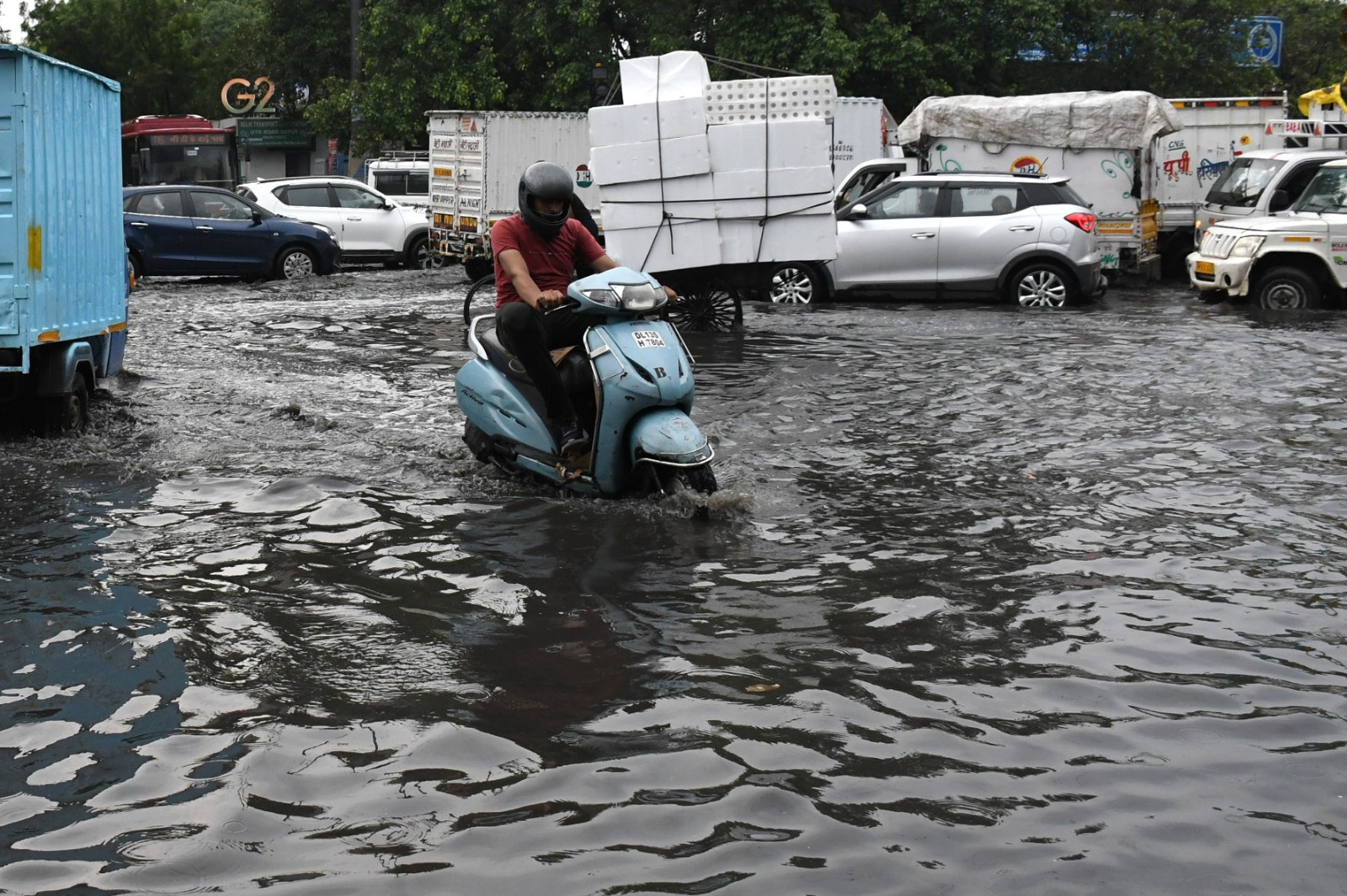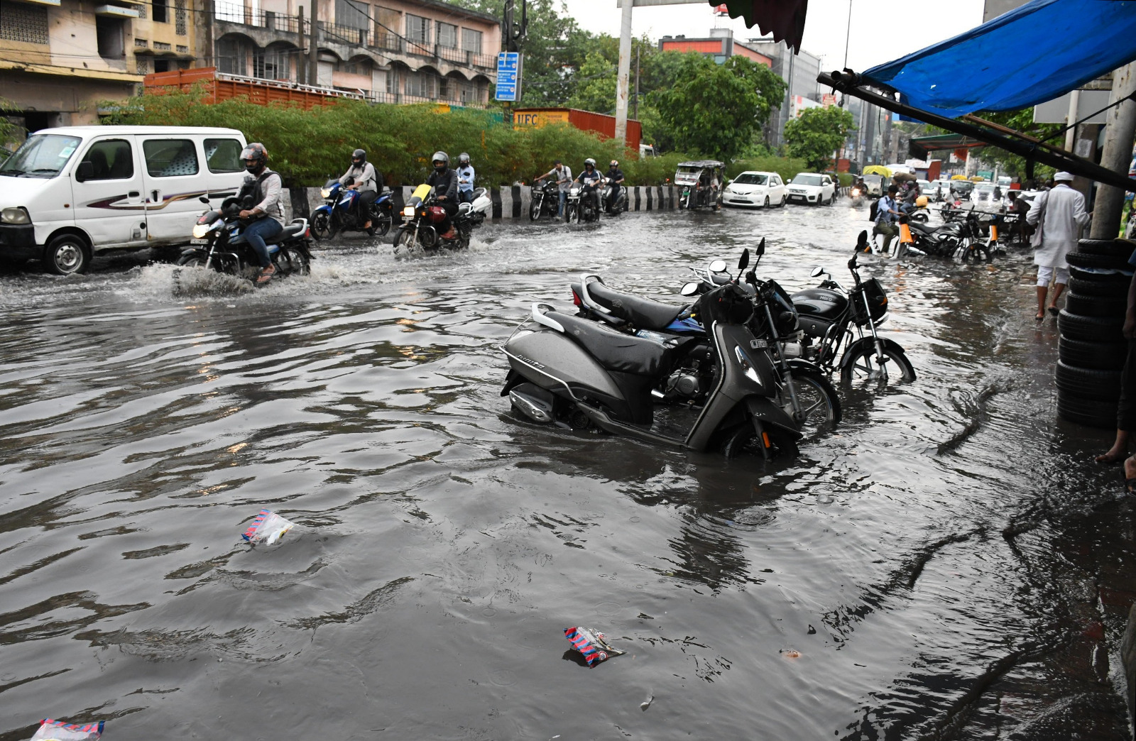 तेज वर्षा के दौरान वजीरपुर औद्याेगिक क्षेत्र के पास मुख्य मार्ग पर हुए जलभराव से गुजरते वाहन