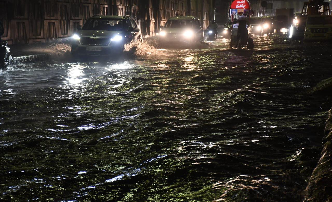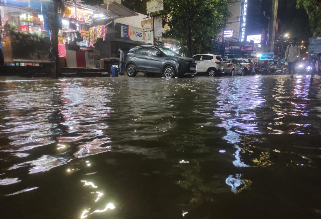 तेज वर्षा के दौरान जीटीके डीपो के सामने मुख्य मार्ग पर हुआ जलभराव।