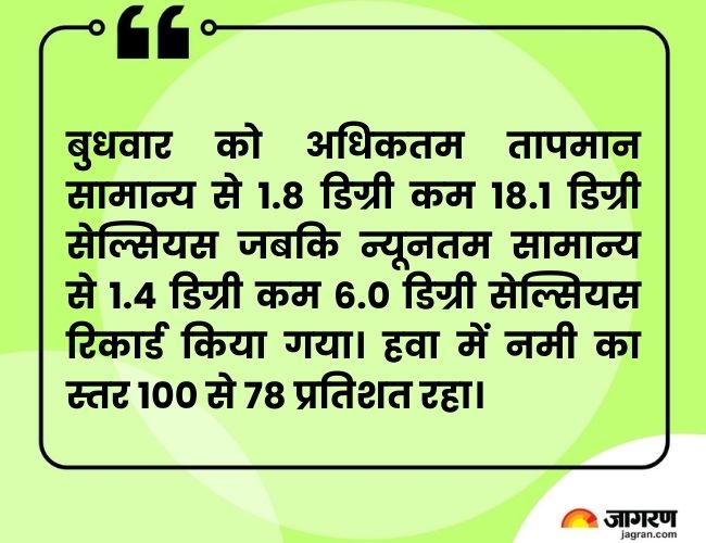 बुधवार को अधिकतम तापमान सामान्य से 1.8 डिग्री कम 18.1 डिग्री सेल्सियस जबकि न्यूनतम सामान्य से 1.4 डिग्री कम 6.0 डिग्री सेल्सियस रिकार्ड किया गया। हवा में नमी का स्तर 100 से 78 प्रतिशत रहा। सबसे कम अधिकतम तापमान 16.3 डिग्री राजघाट का रहा, जबकि सबसे कम न्यूनतम तापमान 5.0 डिग्री पूसा का दर्ज हुआ।