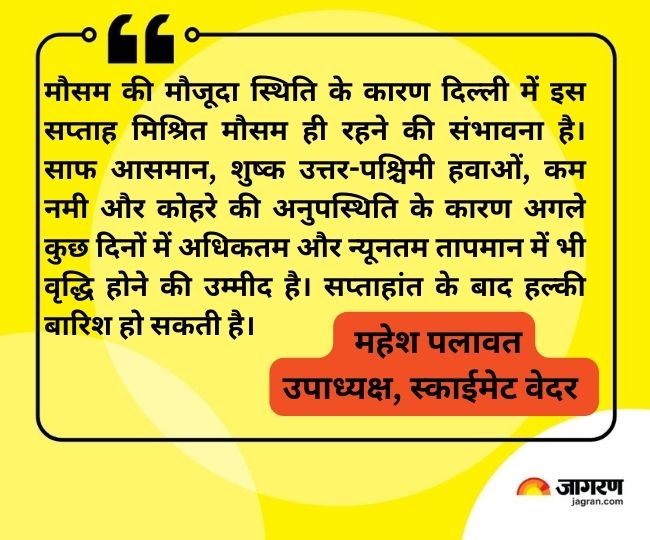 स्काईमेट वेदर के उपाध्यक्ष महेश पलावत ने बताया कि मौसम की मौजूदा स्थिति के कारण दिल्ली में इस सप्ताह मिश्रित मौसम ही रहने की संभावना है।