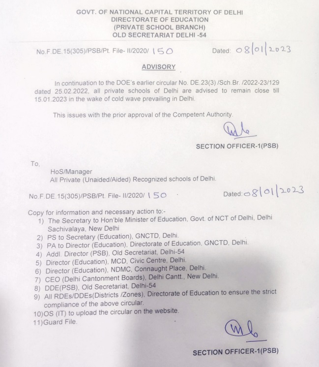 Delhi School Closed दिल्ली सरकार ने प्राइवेट स्कूलों की भी 15 जनवरी तक छुट्टी कर दी है। दिल्ली सरकार के शिक्षा निदेशालय सभी निजी स्कूलों को बंद रखने के निर्देश दिए गए हैं। बता दें कि सरकारी स्कूलों का 1-15 जनवरी तक पहले ही अवकाश है।