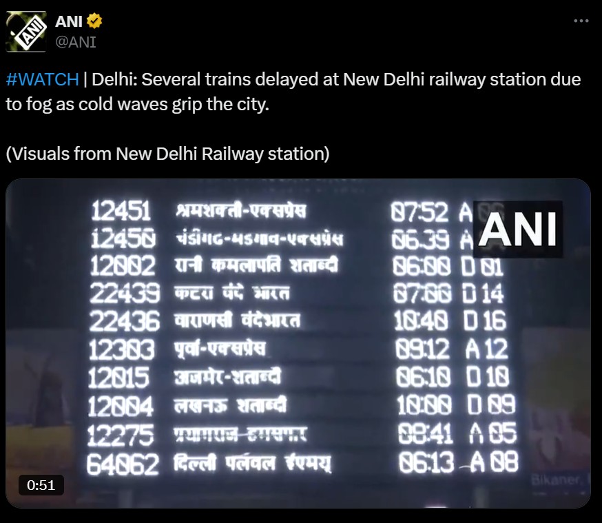 वहीं पर उत्तर भारतीय राज्यों में अत्यधिक कोहरे और खराब दृश्यता के कारण शनिवार को नई दिल्ली रेलवे स्टेशन जाने वाली कई ट्रेनें देरी से चलीं। देरी से चलने वाली ट्रेनों में वंदे भारत एक्सप्रेस, जम्मू राजधानी, आंध्र प्रदेश एक्सप्रेस और ग्रैंड ट्रंक एक्सप्रेस शामिल हैं।