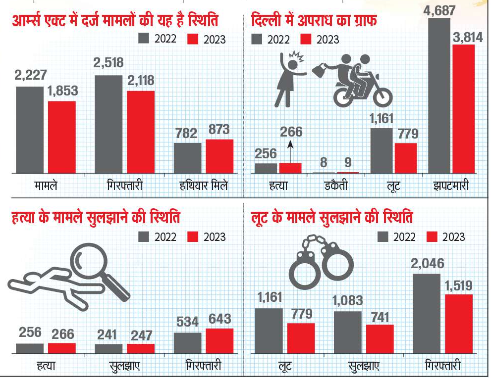 Delhi Crime Cases राजधानी में होने वाली आपराधिक घटनाओं में हथियारों का इस्तेमाल काफी बढ़ा गया है। यही कारण है कि इस वर्ष के शुरुआती छह माह में आर्म्स एक्ट के मामलों में तो कमी आई है लेकिन अपराधियों के पास से हथियारों की बरामदगी अधिक हुई है। हत्या लूटपाट डकैती जैसे अपराधों में नाबालिग युवा और वयस्क तक सभी पिस्टल कट्टा चाकू आदि का इस्तेमाल कर रहे हैं।