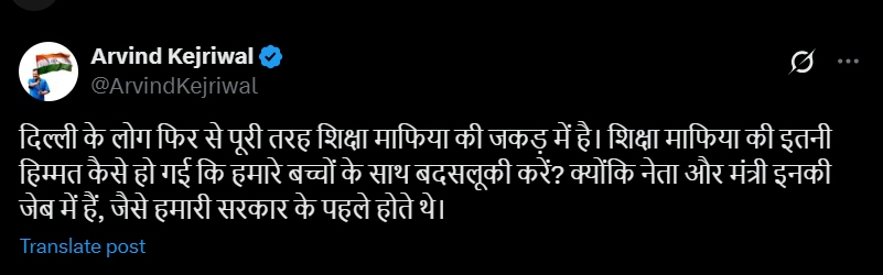 दिल्ली के पूर्व मुख्यमंत्री अरविंद केजरीवाल ने इस घटना पर तीखी प्रतिक्रिया दी। उन्होंने ट्वीट कर कहा, “दिल्ली के लोग फिर से पूरी तरह शिक्षा माफिया की जकड़ में हैं। शिक्षा माफिया की इतनी हिम्मत कैसे हो गई कि हमारे बच्चों के साथ बदसलूकी करें? क्योंकि नेता और मंत्री इनकी जेब में हैं, जैसे हमारी सरकार के पहले होते थे।” केजरीवाल ने एक न्यूज वेबसाइट की रिपोर्ट का हवाला देते हुए दिल्ली सरकार पर निशाना साधा।