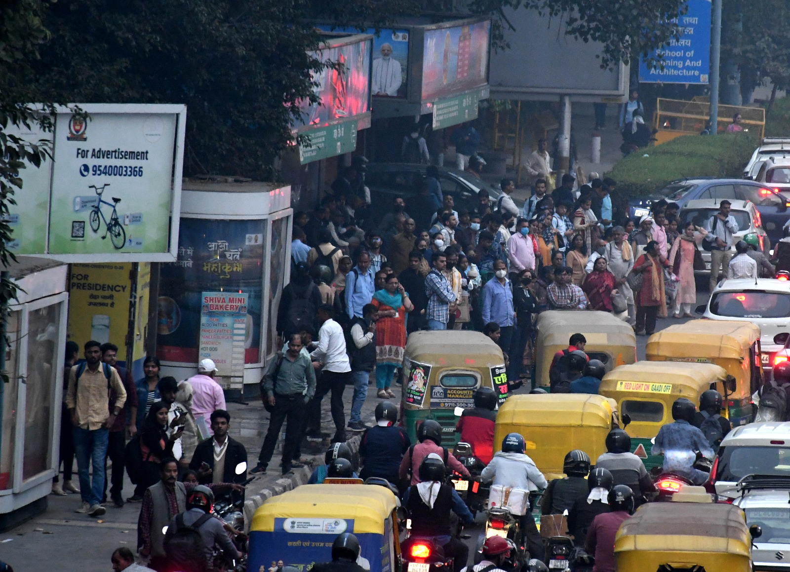 बसों की हड़ताल के कारण कश्मीरी गेट मेट्रो स्टेशन पर यात्रियों की भीड़। ध्रुव कुमार