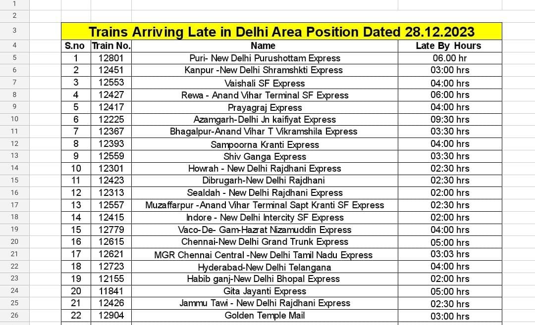 नई दिल्ली से लखनऊ जाने वाली स्वर्ण शताब्दी एक्सप्रेस5.50 घंटे की देरी से दोपहर 12 बजे रवाना होगी। आनंद विहार टर्मिनल-आरा विशेष साढ़े पांच घंटे की देरी से अपराह्न तीन बजे चलेगी। दिल्ली पहुंचने वाली कई ट्रेनें एक से 15 घंटे तक की देरी से चल रही हैं।