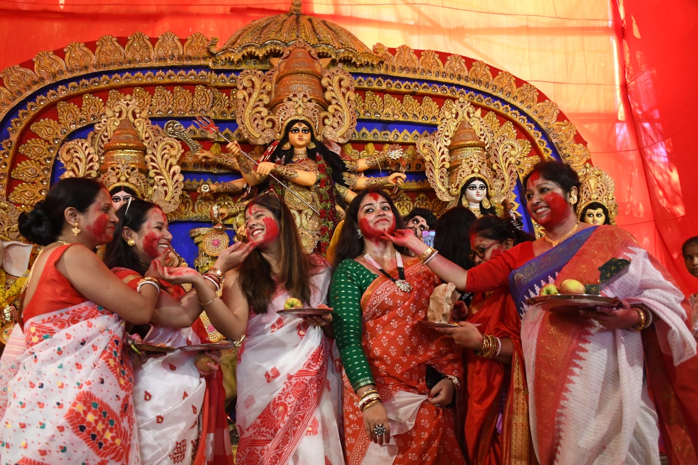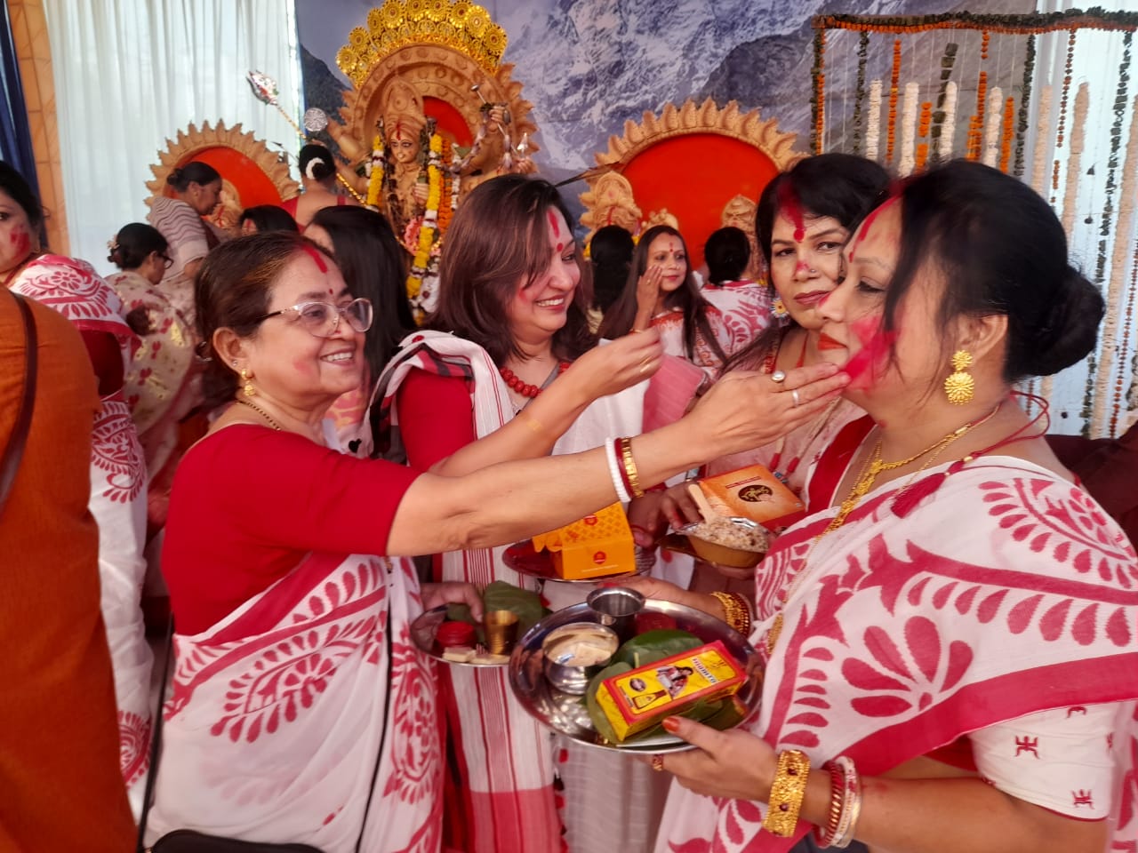 मुख्य रूप से बंगाली व असमिया समुदाय की ओर से बनाए गए पंडालों में यह सिंदूर खेला देखने को मिला, जिसमें स्थानीय लोगों ने भी श्रद्धा व उल्लास भाव के साथ शिरकत की।