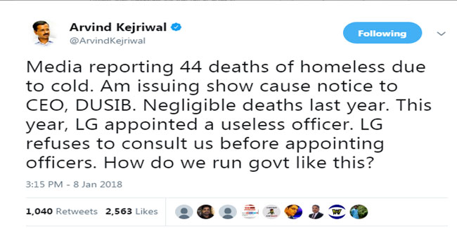 यहां बता दें कि दिल्ली के सीएम अरविंद केजरीवाल सोमवार को ट्वीट कर कहा था कि मीडिया रिपोर्ट के मुताबिक ठंड से 44 बेघर लोगों की मौत हुई। इस मामले में वह DUSIB (दिल्ली अर्बन शेल्टर इंप्रूवमेंट बोर्ड) के सीईओ को कारण बताओ नोटिस जारी कर रहे हैं। केजरीवाल ने आगे कहा है, 'इस साल एलजी ने एक बेकार अधिकारी को इस पद पर नियुक्त किया। एलजी अधिकारियों को नियुक्त करने से पहले हमसे मशविरा लेने से इन्कार करते रहे हैं, ऐसे में हम सरकार कैसे चलाएं?'