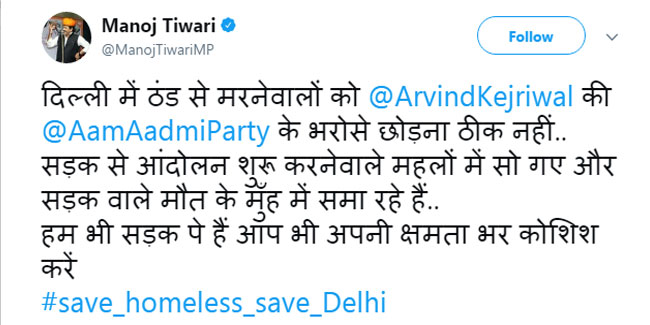 मौतों के लिए दिल्ली भाजपा अध्यक्ष मनोज तिवारी ने आम आदमी पार्टी की सरकार को जिम्मेदार ठहराया है।तिवारी ने कहा कि हम सभी नए वर्ष में पहुंच गए हैं, लेकिन दिल्ली सरकार का रवैया नहीं बदला। मुख्यमंत्री अरविंद केजरीवाल की चिंता दिल्लीवासियों की जगह अपनी कुर्सी और पार्टी को लेकर है। यही कारण है कि इस कड़ाके की ठंड में बेघर लोग खुले आसमान के नीचे सोने को मजबूर हैं ,जिससे कई लोगों की मौत हो रही है।