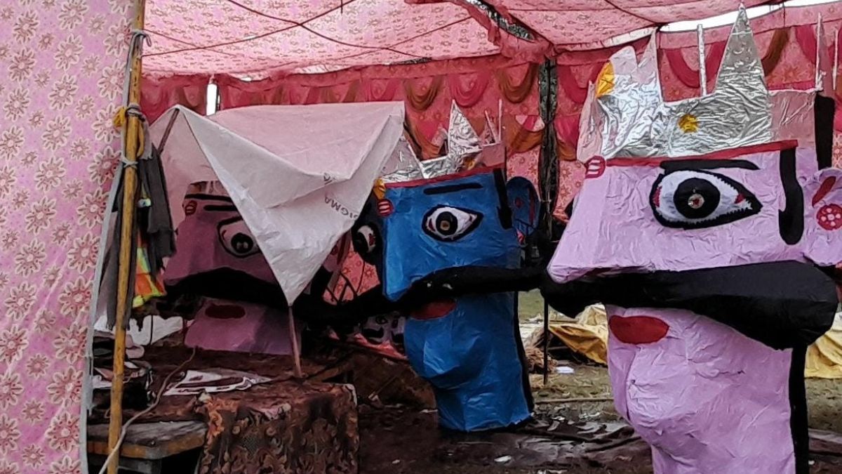 आइपी एक्सटेंशन स्थित सरस्वती अपार्टमेंट के पास मैदान में तैयार होते रावण कुंभकर्ण तथा मेघनाद के पुतले।जागरण