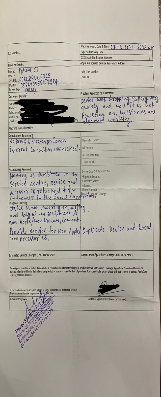 अगले दिन 7 दिसंबर, 2021 को उन्होंने इस खराब मोबाइल फोन को नोएडा के सेक्टर-38A स्थित गार्डन गैलेरिया माल में मौजूद एप्पल कंपनी के अधिकृत सर्विस सेंटर पर भिजवाया। सर्विस सेंटर ने मोबाइल फोन को देखते ही बता दिया कि इसकी पैकिंग, एसेसरीज और मोबाइल फोन सबकुछ डुप्लीकेट है। सर्विस सेंटर पर मौजूद कस्टमर केयर एग्जीक्यूटिव ने इस खराब मोबाइल फोन और एसेसरीज (चार्जर व हेडफोन) को अपने टेक्नीशियन से चेक करवाया। टेक्नीशियन ने भी पूरी जांच-पड़ताल के बाद मोबाइल फोन और एसेसरीज को नकली बताया। इसके बाद एप्पल सर्विस सेंटर के एग्जीक्यूटिव ने लिखित में इसकी रिपोर्ट ग्राहक को सौंप दी।
