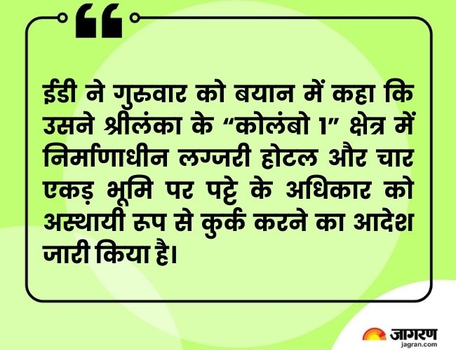 ईडी ने गुरुवार को बयान में कहा कि उसने श्रीलंका के “कोलंबो 1” क्षेत्र में निर्माणाधीन लग्जरी होटल और चार एकड़ भूमि पर पट्टे के अधिकार को अस्थायी रूप से कुर्क करने का आदेश जारी किया है। गुरुग्राम के सेक्टर 66 में बादशाहपुर और घसोला गांवों में 19.08 करोड़ रुपये की लगभग 2.82 एकड़ जमीन (गुड अर्थ बिजनेस पार्क प्राइवेट लिमिटेड के नाम पर) भी कुर्क की गई है।