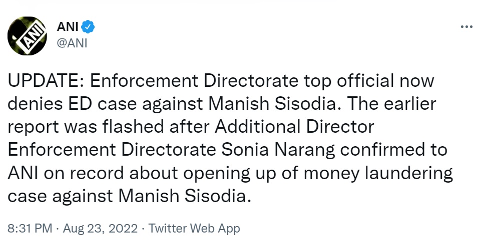 हालांकि अब केस दर्ज होने की बात से प्रवर्तन निदेशालय के शीर्ष अधिकारी ने इनकार किया है। थोड़ी देर पहले ही अतिरिक्त निदेशक प्रवर्तन निदेशालय सोनिया नारंग ने मनीष सिसोदिया के खिलाफ मनी लॉन्ड्रिंग मामला दर्ज करने की बात कही थी।