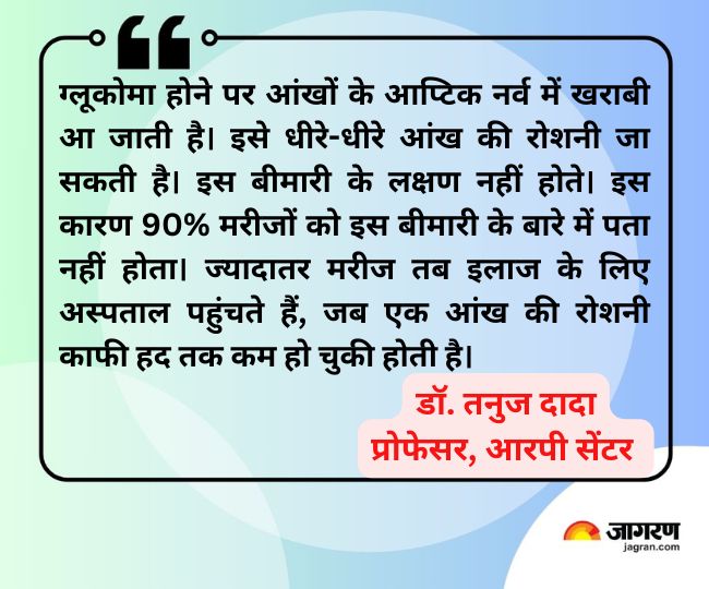 आरपी सेंटर के प्रोफेसर डॉ. तनुज दादा ने बताया कि ग्लूकोमा होने पर आंखों के आप्टिक नर्व में खराबी आ जाती है। इसे धीरे-धीरे आंख की रोशनी जा सकती है। इस बीमारी के लक्षण नहीं होते।