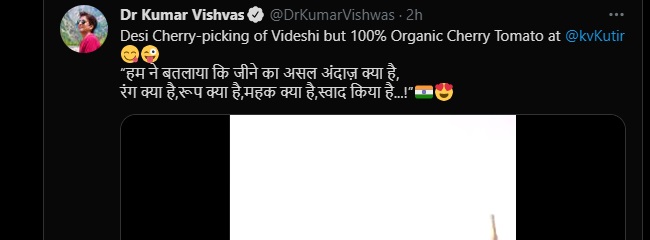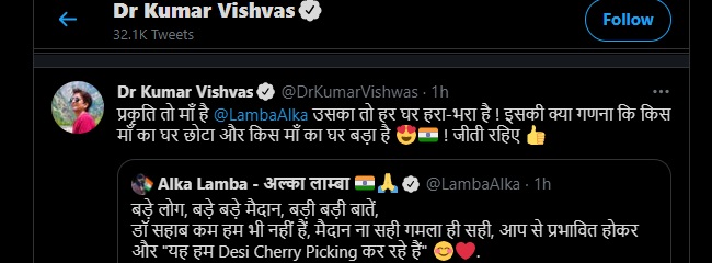 दरअसल, कांग्रेस की दिग्गज नेता अलका लांबा ने कुमार विश्वास के ट्वीट एकाउंट पर टैग करते हुए लिखा है 'बड़े लोग, बड़े बड़े मैदान, बड़ी बड़ी बातें, डॉ सहाब कम हम भी नहीं हैं, मैदान ना सही गमला ही सही, आप से प्रभावित होकर और "यह हम Desi Cherry Picking कर रहे हैं।' वहीं, इस पर कुमार विश्वास कहा रुकने वाले थे। उन्होंने इसके जवाब में ट्वीट किया है- 'प्रकृति तो मां है @LambaAlka उसका तो हर घर हरा-भरा है ! इसकी क्या गणना कि किस मां का घर छोटा और किस मां का घर बड़ा है। जीती रहिए।'