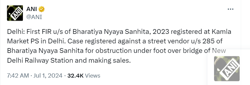 समाचार एजेंसी एएनआई के मुताबिक, कमला मार्केट थाने में भारतीय न्याय संहिता की धारा 2023 के तहत पहली एफआईआर दर्ज की गई। आज से तीन नए आपराधिक कानून लागू हो गए हैं। नई दिल्ली रेलवे स्टेशन के फुटओवर ब्रिज के नीचे अवरोध पैदा करने और बिक्री करने के आरोप में भारतीय न्याय संहिता की धारा 285 के तहत एक रेहड़ी-पटरी वाले के खिलाफ मामला दर्ज किया गया है।