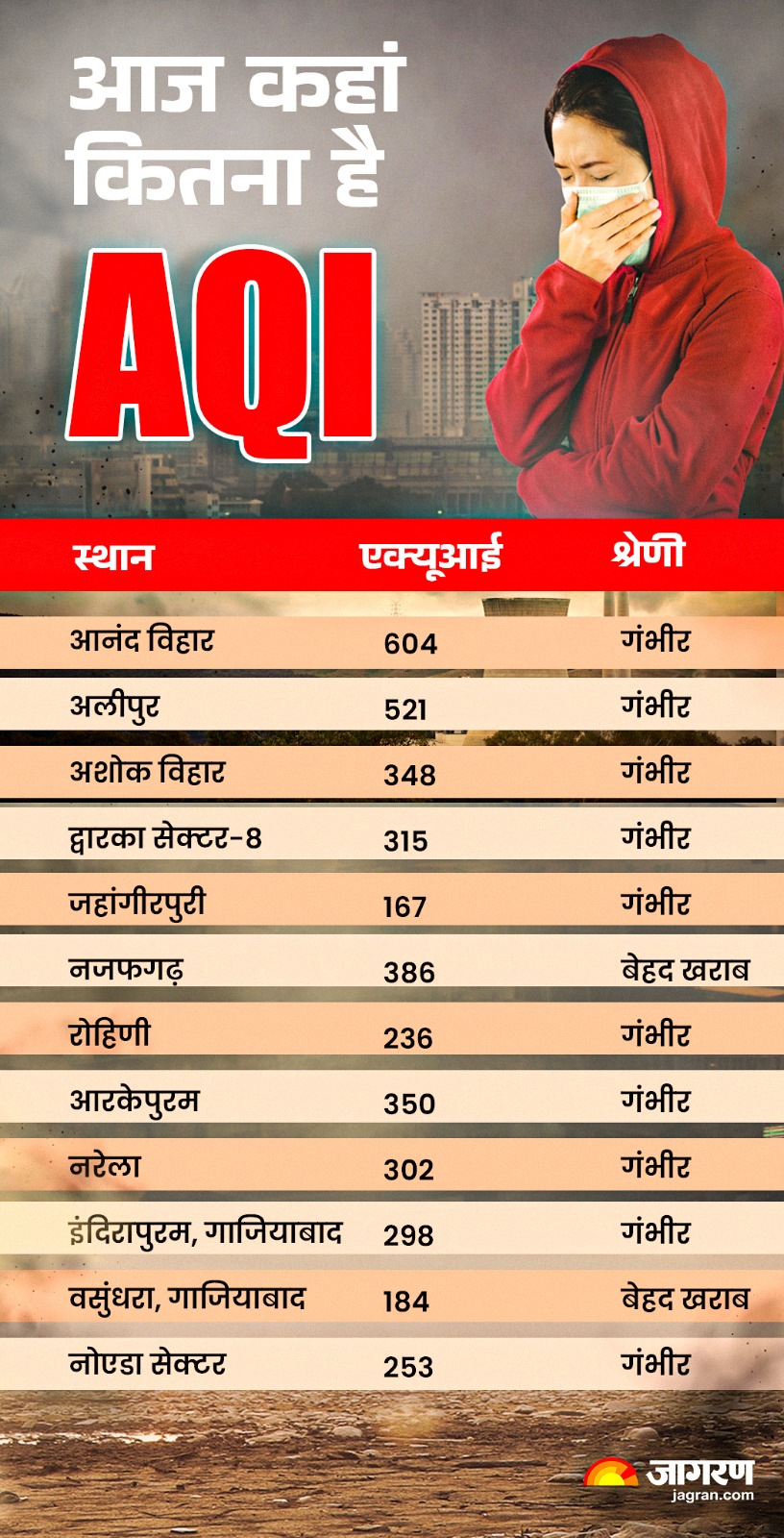 आइक्यूएयर ने सुबह में दिल्ली का एयर इंडेक्स 603 बताया। जहांगीरपुरी में सबसे अधिक एयर इंडेक्स 1005 बताया। हवा की गति कम और स्मॉग होने से वायु प्रदूषण बढ़ा है। दिल्ली में हवा की गुणवत्ता अगले दो दिन बेहद खराब श्रेणी में रह सकती है।