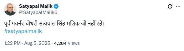 पूर्व राज्यपाल एवं वरिष्ठ जननेता श्री सत्यपाल मलिक जी के निधन का समाचार अत्यंत दुःखद है। वे हमेशा जनहित की बात निर्भीकता से रखते रहे। जननायक जनता पार्टी उनकी बेबाक राजनीति, किसान हितैषी सोच और सार्वजनिक जीवन में सादगी को सादर नमन करती है। ईश्वर दिवंगत आत्मा को शांति प्रदान करें।… pic.twitter.com/32ODPqDZKm