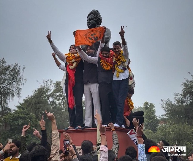 डूसू की कार्यकारी परिषद में विजेता बनने के बाद विवेकानंद प्रतिमा के पास खड़े होकर खुशी जाहिर करते विजेता छात्र। सौजन्य एबीवीपी