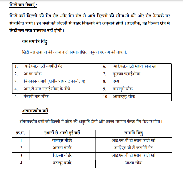 इन जगहों पर सिटी बस सेवाओं की आवाजाही में कटौती की जाएगी: आईएसबीटी कश्मीरी गेट, आईएसबीटी सराय काले खां, आश्रम चौक, मूलचंद फ्लाईओवर, विवेकानंद मार्ग (क्षेत्रीय पासपोर्ट कार्यालय), एम्स, आरटीआर फ्लाईओवर के नीचे, मायापुरी चौक, पंजाबी बाग चौक और आजादपुर चौक। वहीं, सभी अंतरराज्यीय बसों को दिल्ली में प्रवेश की अनुमति होगी, लेकिन उनका आखिरी स्टॉप रिंग रोड पर होगा।