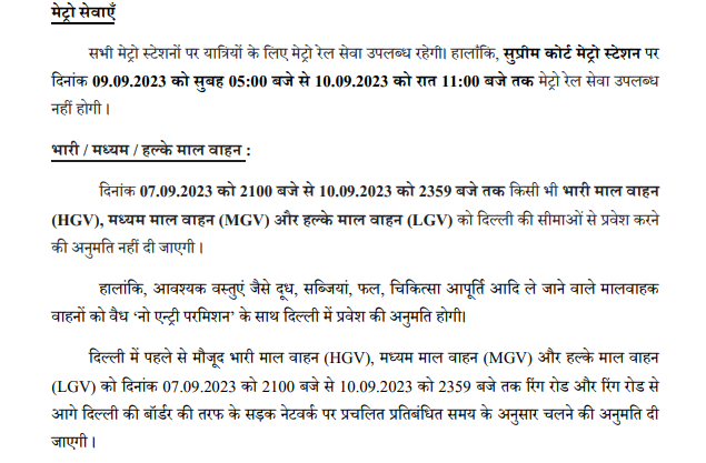 इसके अलावा दिल्ली मेट्रो के संचालन को लेकर भी एडवाइजरी जारी की गई है। एडवाइजरी के अनुसार, दिल्ली के सभी मेट्रो पर यात्रियों के लिए मेट्रो सेवा उपलब्ध रहेगी। हालांकि, सुप्रीम कोर्ट मेट्रो स्टेशन पर 9 सितंबर को सुबह 5 बजे से 10 सितंबर को रात 11 बजे तक मेट्रो सेवा उपलब्ध नहीं होगी।