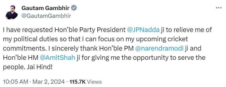 उन्होंने सोशल साइट एक्स पर लिखा, मैंने भाजपा अध्यक्ष जेपी नड्डा से मुझे अपने राजनीतिक कर्तव्यों से मुक्त करने का अनुरोध किया है, ताकि मैं अपनी आगामी क्रिकेट प्रतिबद्धताओं पर ध्यान केंद्रित कर सकूं। उन्होंने आगे लिखा कि मैं पीएम मोदी और गृहमंत्री अमित शाह को धन्यवाद देता हूं कि उन्होंने मुझे लोगों की सेवा करने का मौका दिया। जय हिंद।