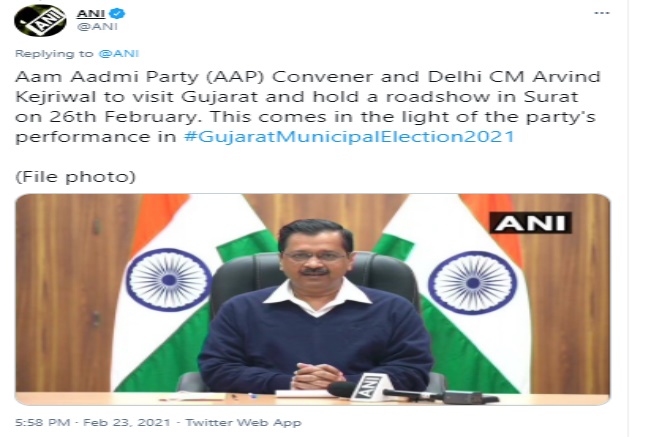 समाचार एजेंसी एएनआइ के मुताबिक, दिल्ली के मुख्यमंत्री अरविंद केजरीवाल 26 फरवरी को गुजरात जाएंगे और सूरत में रोड शो करेंगे। पार्टी उम्मीदवारों के शानदार प्रदर्शन के बाद यह आम आदमी पार्टी के किसी सीनियर लीडर का यह पहला दौरा होगा।