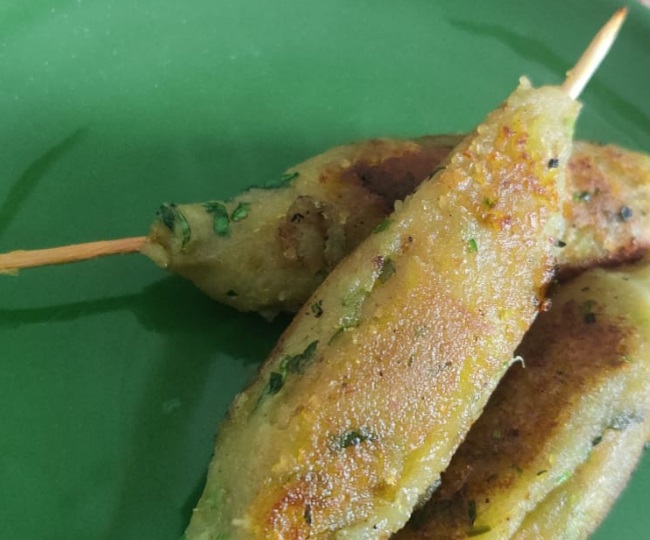 अब इसे अच्छी तरह से मैश करें सभी सामग्री इसमें मिला लें। अब हथेलियों पर तेल लगाएं और तिरछी बाल बनाएं। स्टिक को बाल के बीच में डालें और कबाब बनाएं। एक पैन में चारों ओर से भूरा होने तक तलें धनिये की चटनी के साथ गरमागरम परोसें।